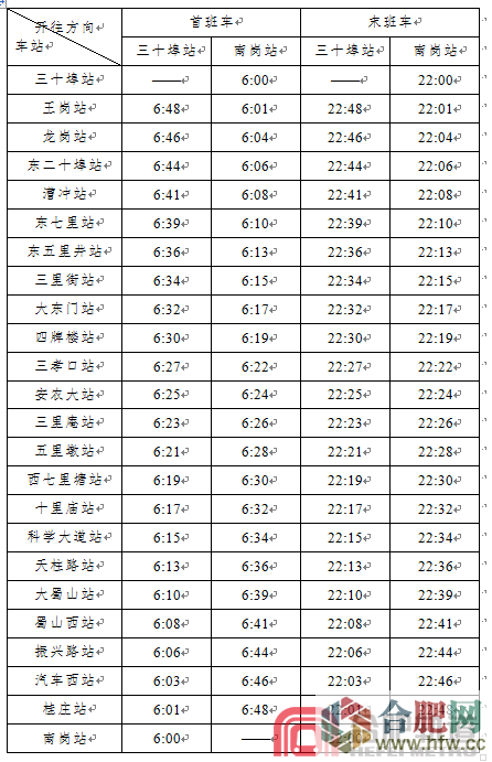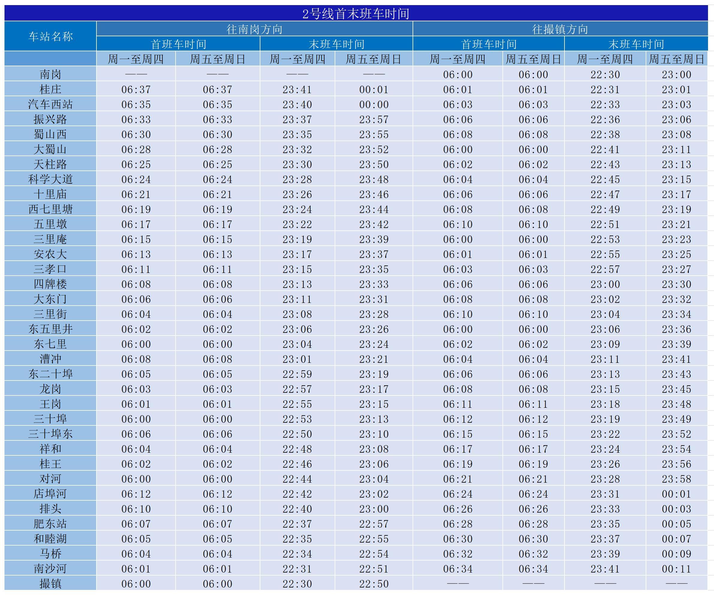 1、2號(hào)線自開(kāi)通運(yùn)營(yíng)之日起,即與1號(hào)線同步實(shí)施新的運(yùn)營(yíng)方案。兩端站首班車(chē)發(fā)車(chē)時(shí)間均為每日早晨6:00,末班車(chē)發(fā)車(chē)時(shí)間均為晚間22:00。
