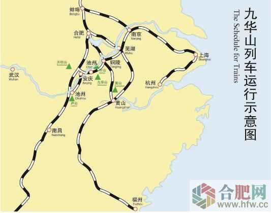 可乘列車至池州火車站、銅陵北火車站、合肥火車站后轉車至九華山