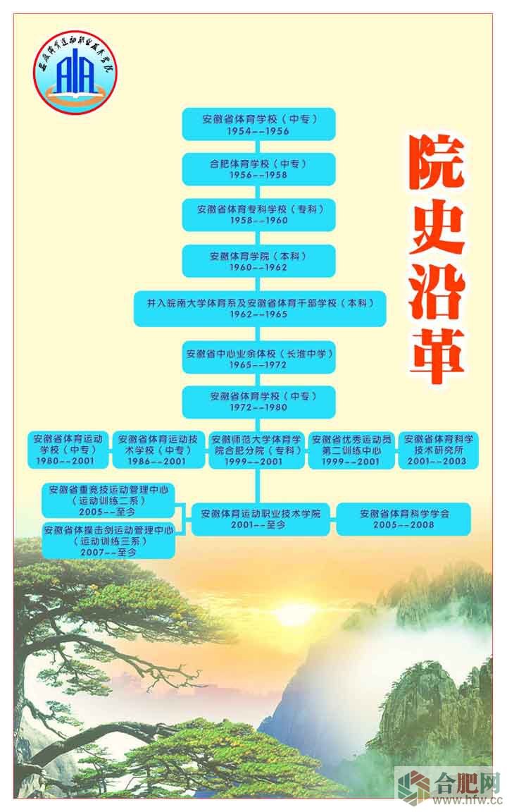 安徽體育運動職業技術學院前身為安徽省體育學校,創辦于1954年,后歷經數次變遷,先后8次更名,2001年6月26日經安徽省政府批準,升格成立安徽體育運動職業技術學院。